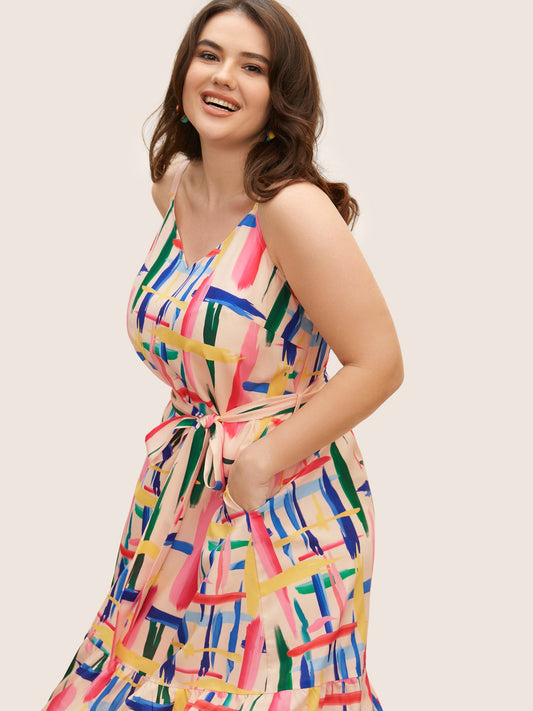 Colored Brush Print Belted Midi Cami Dress