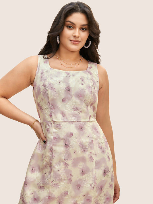 Floral Textured Square Neck Pleated Split Front Dress