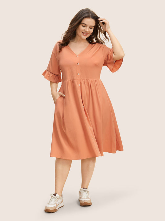 Solid Button Detail Cut Out Ruffle Sleeve Dress