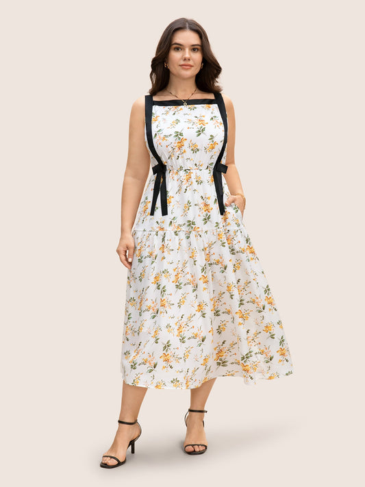 Square Neck Contrast Trim Floral Print Dress