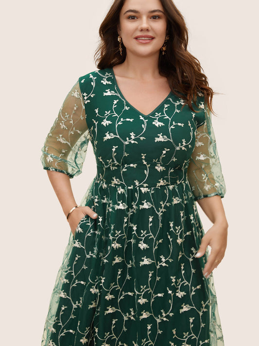 Floral Embroidered Mesh Lantern Sleeve Dress