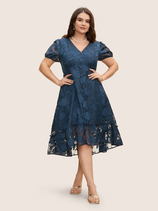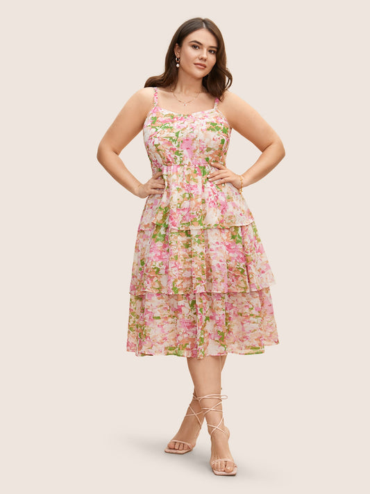 Chiffon Floral Shirred Ruffle Layered Hem Dress