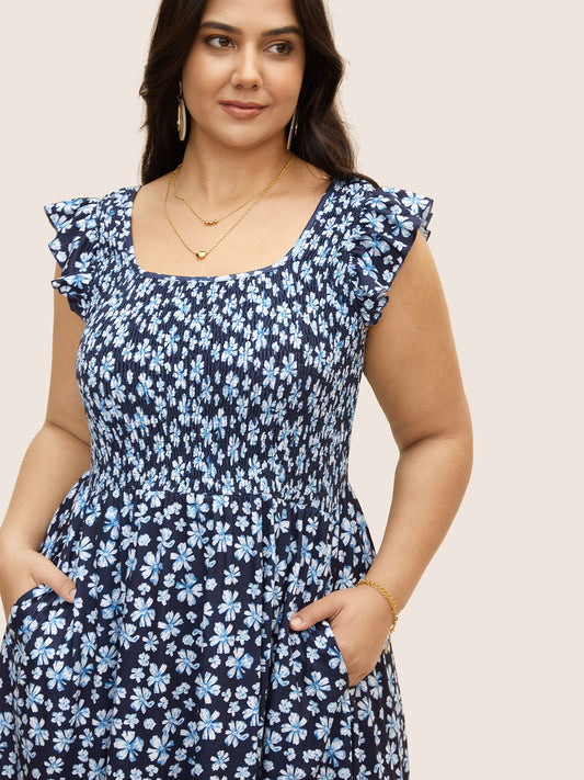Floral Smocking Back Shirred Dress