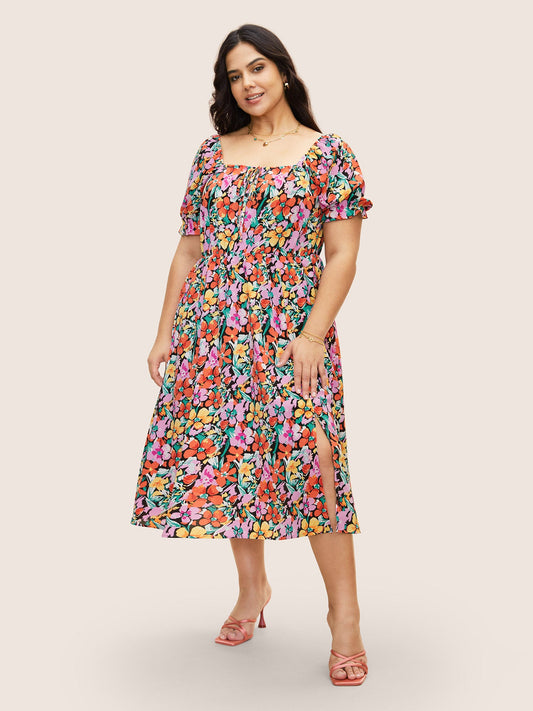 Square Neck Floral Drawstring Split Hem Dress