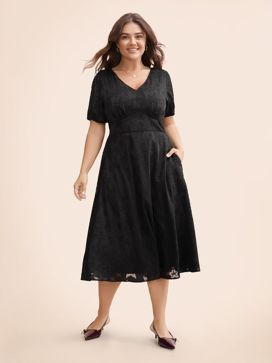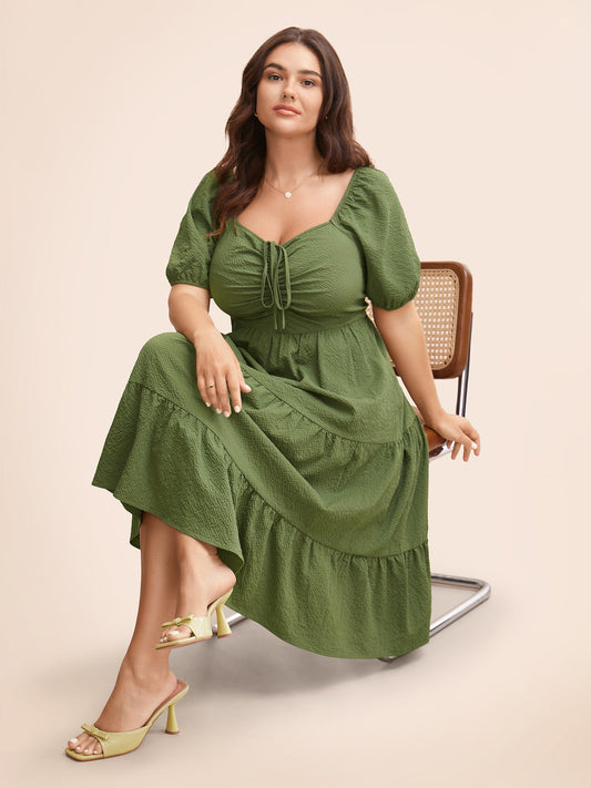 Textured Mesh Ruffle Hem Puff Sleeve Dress