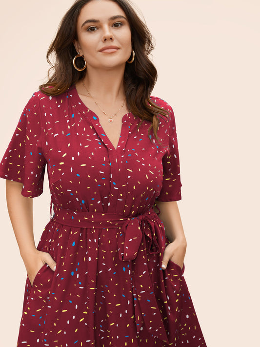 V Neck Boho Print Ruffle Sleeve Midi Dress