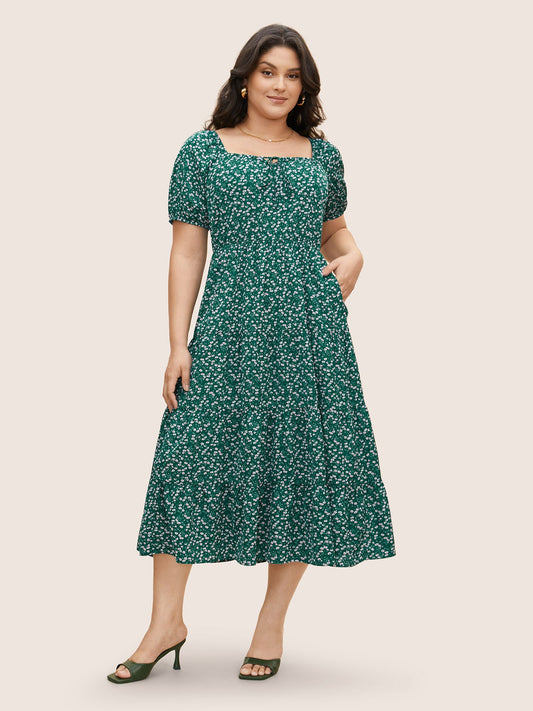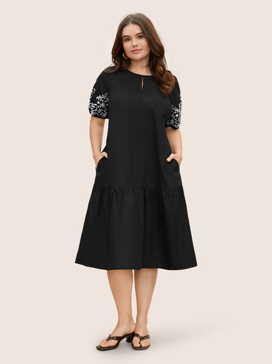 Floral Embroidered Keyhole Lantern Sleeve Dress