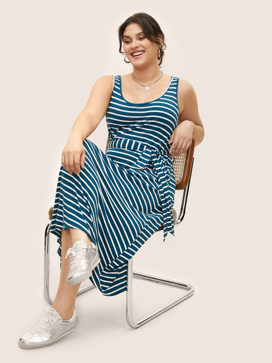Striped Belted Slit Hem Lantern Sleeve Dress