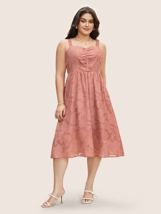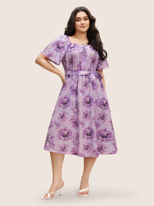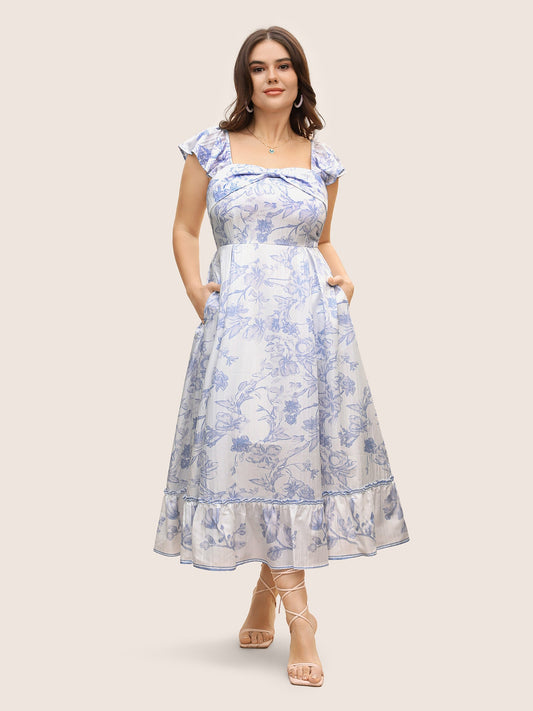Square Neck Floral Twist Ruffle Cap Sleeve Dress