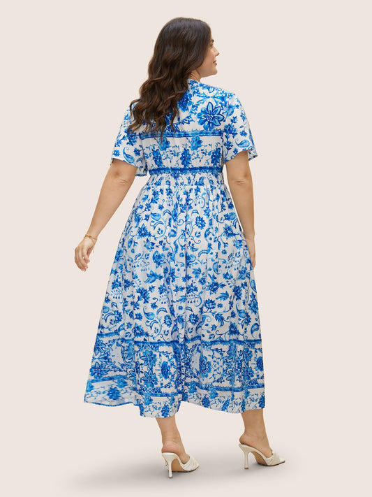 Notched Collar Boho Print Shirred Dress