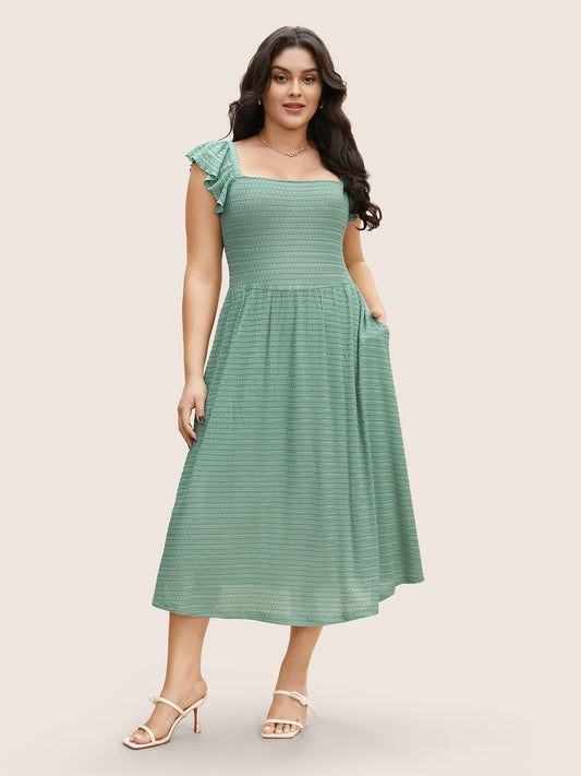 Plain Textured Ruffle Cap Sleeve Midi Dress