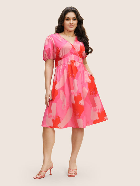 Brush Print Wrap Shirred Lantern Sleeve Dress