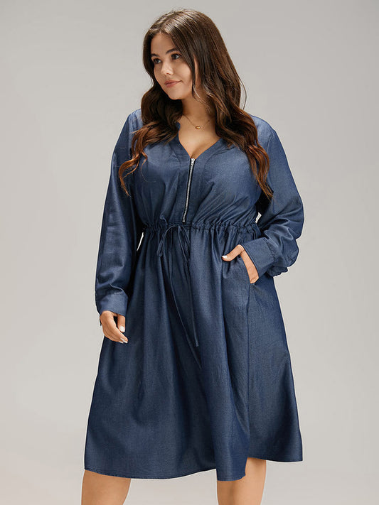 Denim Half Zip Drawstring Elastic Waist Dress