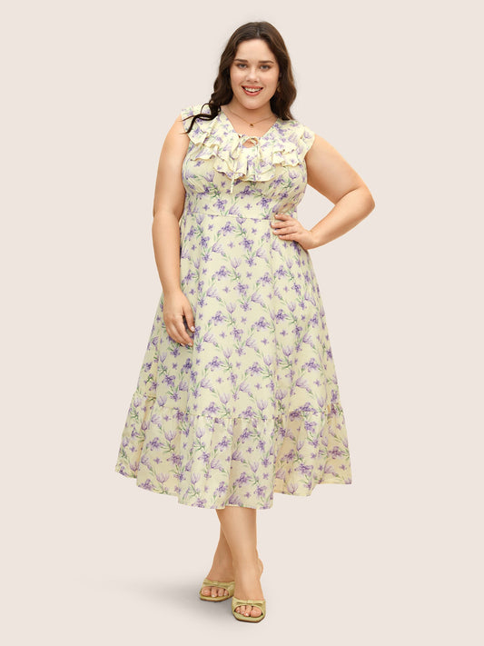 Floral Ruffles Shirred Sleeveless Midi Dress