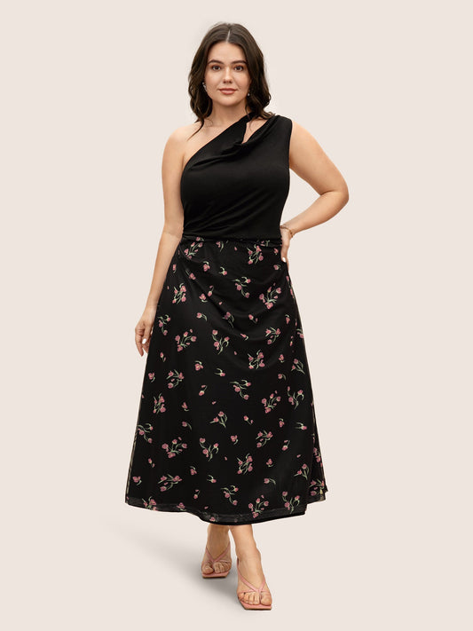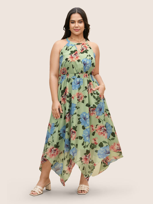 Floral Shirred Asymmetrical Hem Sleeveless Dress