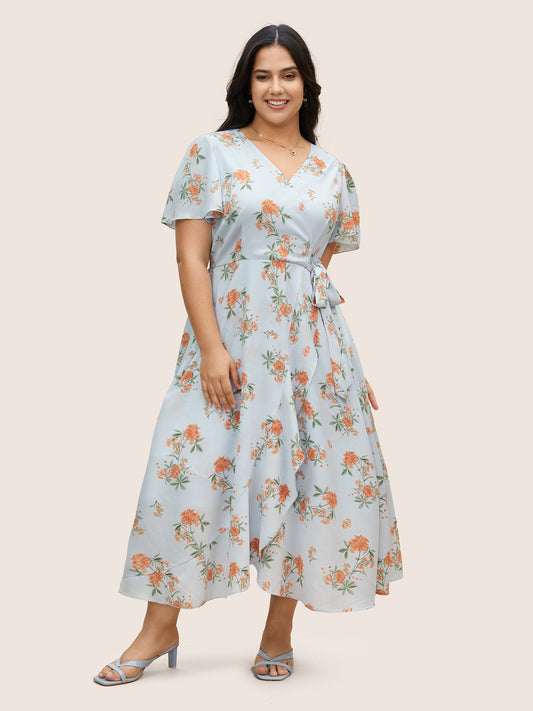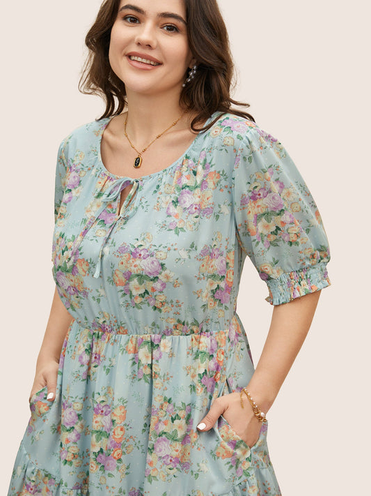 Floral Shirred Tie Knot Lantern Sleeve Dress