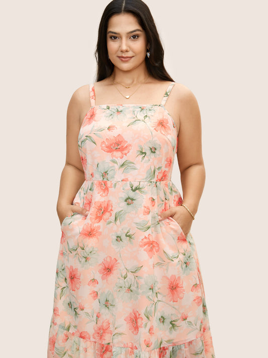 Watercolor Floral Shirred Ruffle Hem Cami Dress