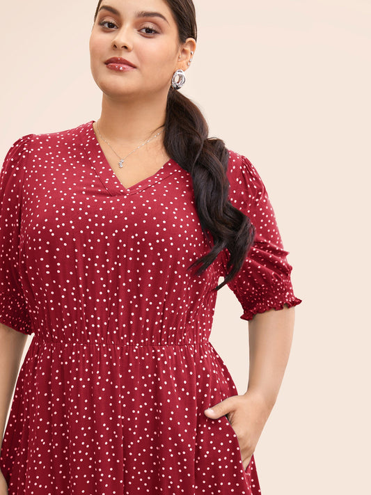 Polka Dot Shirred Pocket Flutter Hem Dress