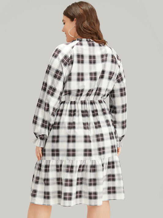 Plaid Ties Ruffle Trim Layered Raglan Sleeve Dress
