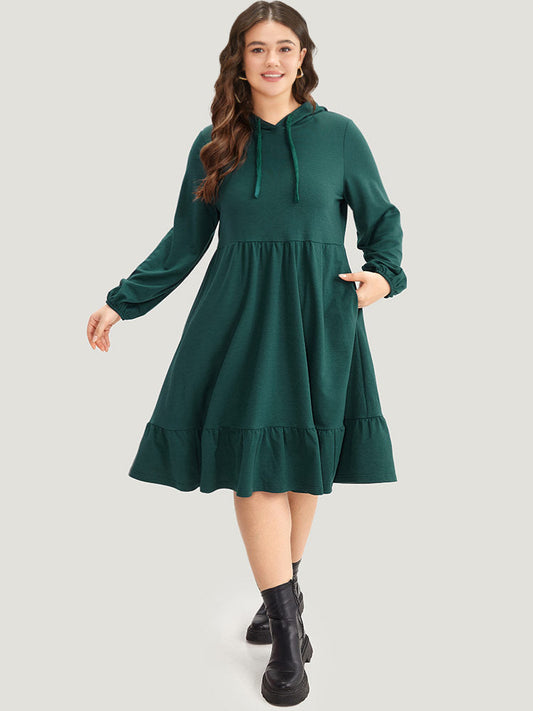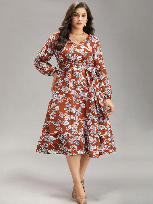Floral Print Elastic Cuffs Ruffle Hem Dress
