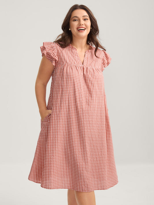 Gingham Print Belted Flutter Sleeve Midi Dress