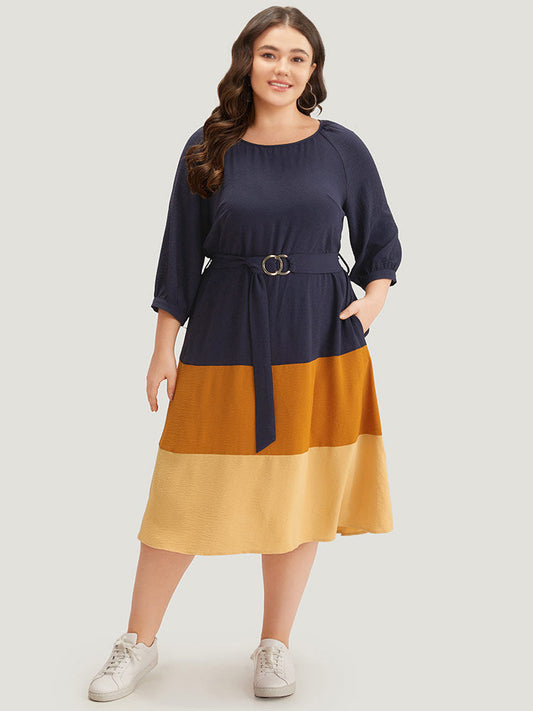 Colorblock Contrast Metal Detail Lantern Sleeve Dress