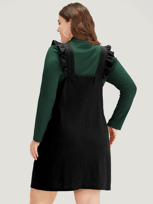 Solid Square Neck Button Up Pocket Ruffle Trim Cami Dress