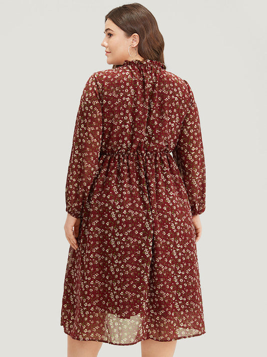 Ditsy Floral Frill Trim Lantern Sleeve Dress
