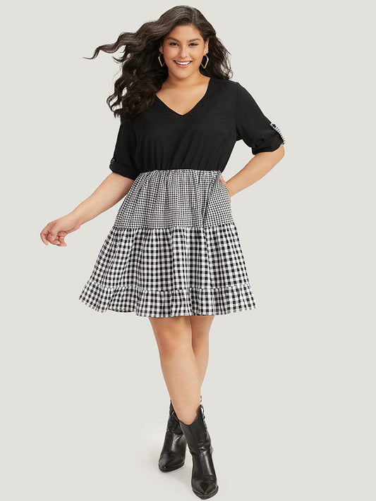 Gingham Patchwork Pocket Tab Sleeve Dress
