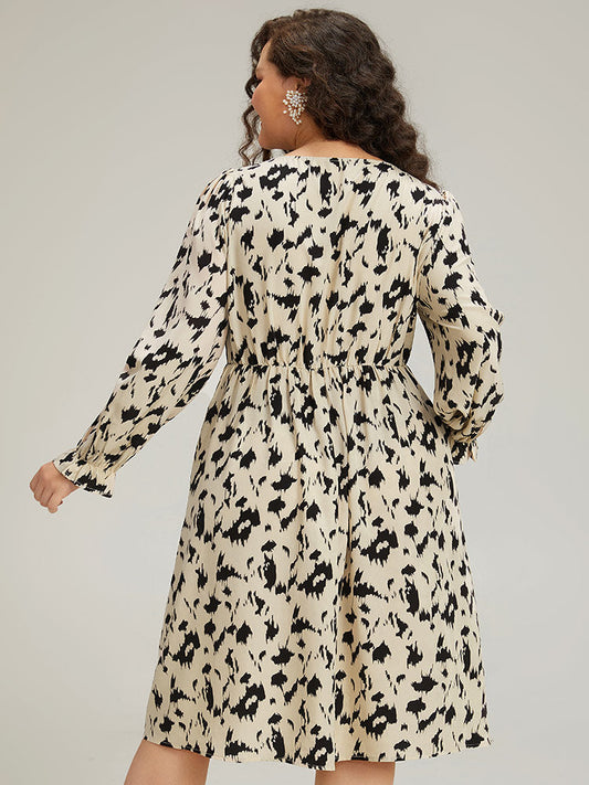 Plain Notched Shirred Button Through Ruffle Sleeve Dress
