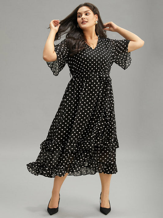 Polka Dot Ruffles Pocket V Neck Mesh Belted Dress