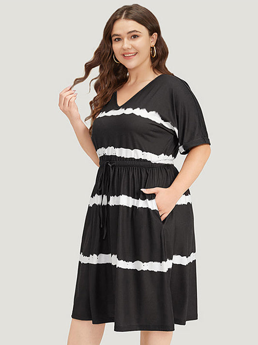 Striped Tie Dye Pocket Drawstring Gathered Dress