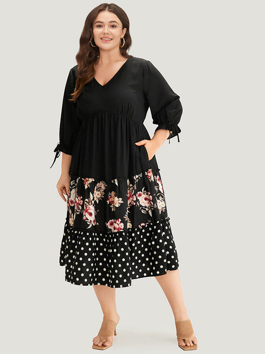 Polka Dot Patchwork Floral Knot Pocket Lantern Sleeve Dress
