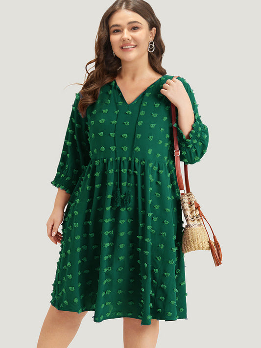 Polka Dot Tassels Ties Shirred Cuffs Pocket Dress