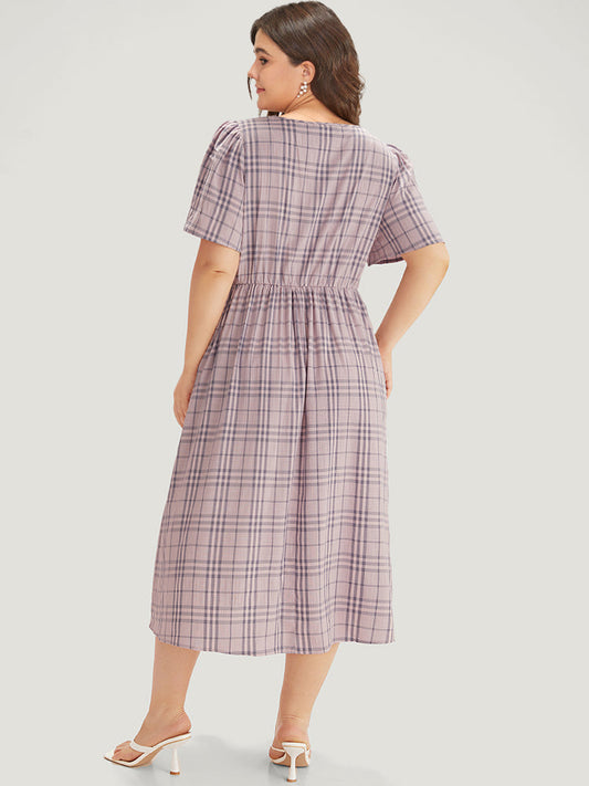 Plaid V Neck Gathered Ruffle Sleeve Dress