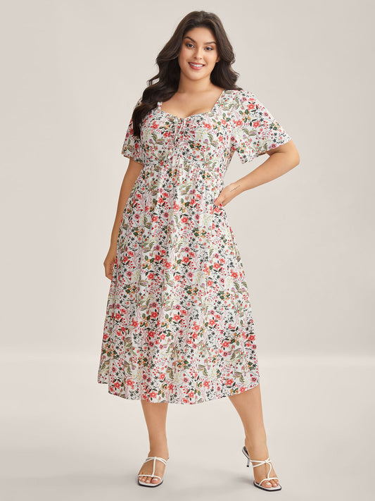 Floral Print Neck Tie Pockets Midi Dress