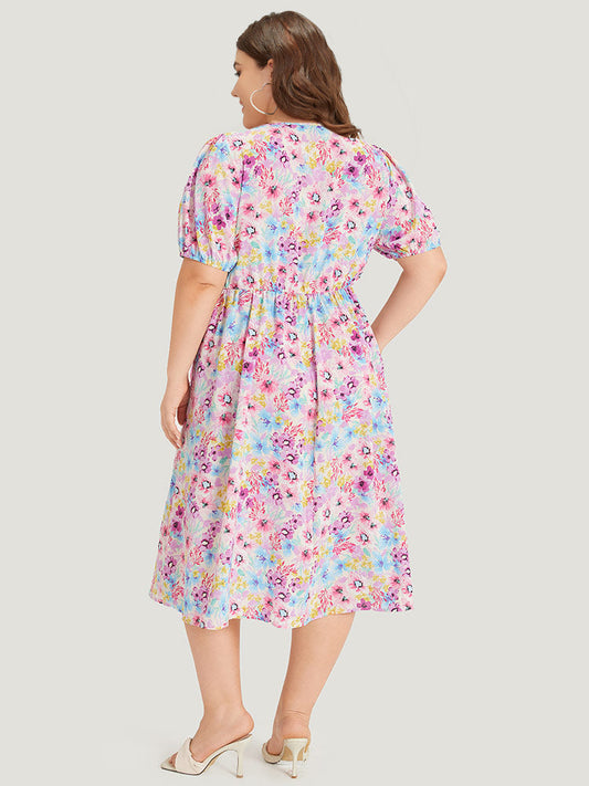 Floral Print V Neck Gathered Puff Sleeve Dress