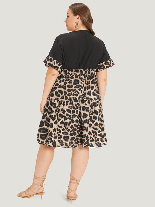 Leopard Print Patchwork V Neck Bell Sleeve Dress