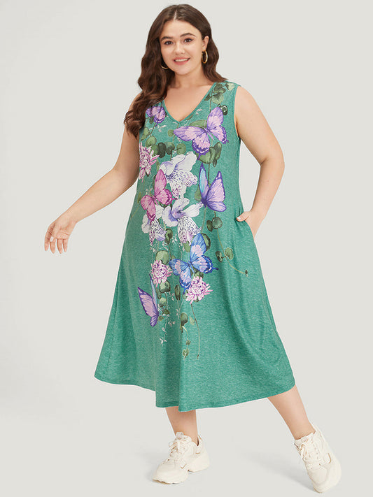 Floral & Butterfly Print V Neck Pocket Tank Dress