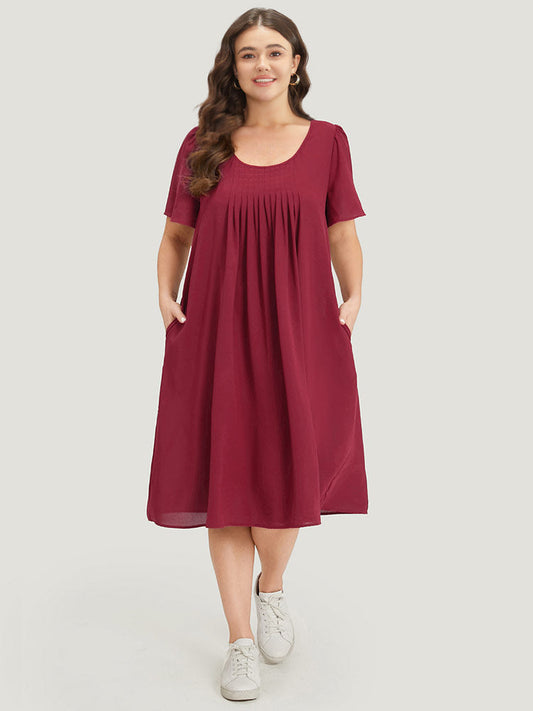 Plain Plicated Detail Round Neck Ruffle Sleeve Dress