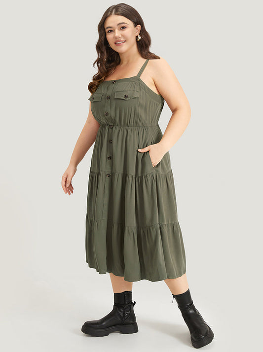 Solid Button Detail Pocket Ruffle Layered Hem Cami Dress
