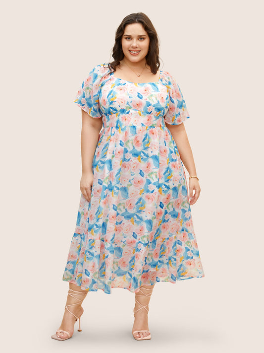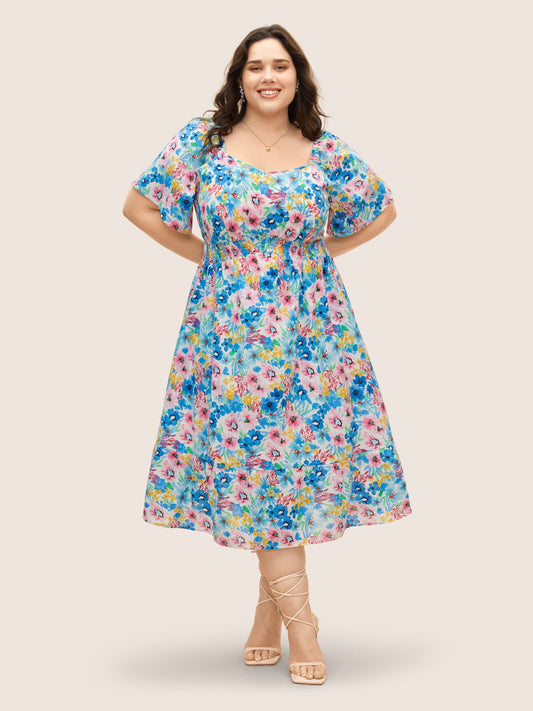 Watercolor Floral Shirred Puff Sleeve Midi Dress