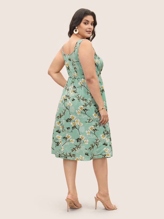 Ditsy Floral Print Elastic Waist Shirred Button Detail Dress
