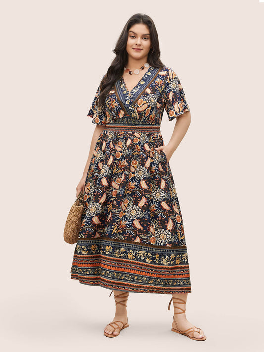 Bandana Print Shirred Overlap Collar Flutter Sleeve Dress