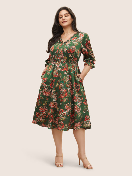 Floral Print Flutter Sleeve Shirred Pleated Dress