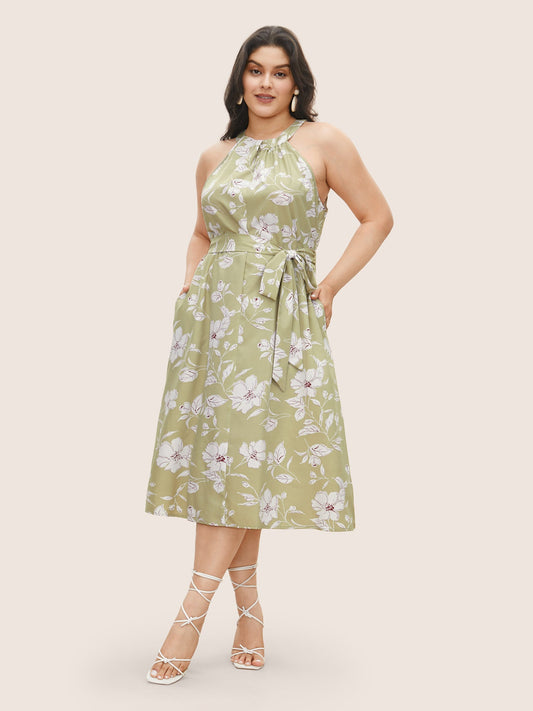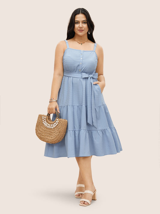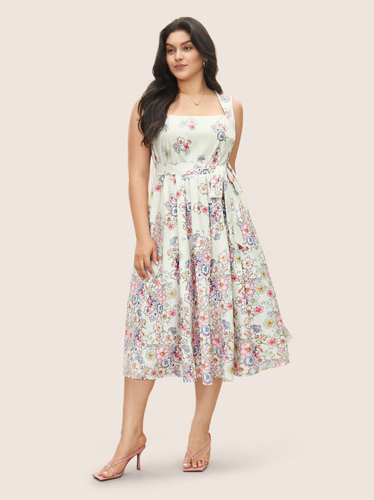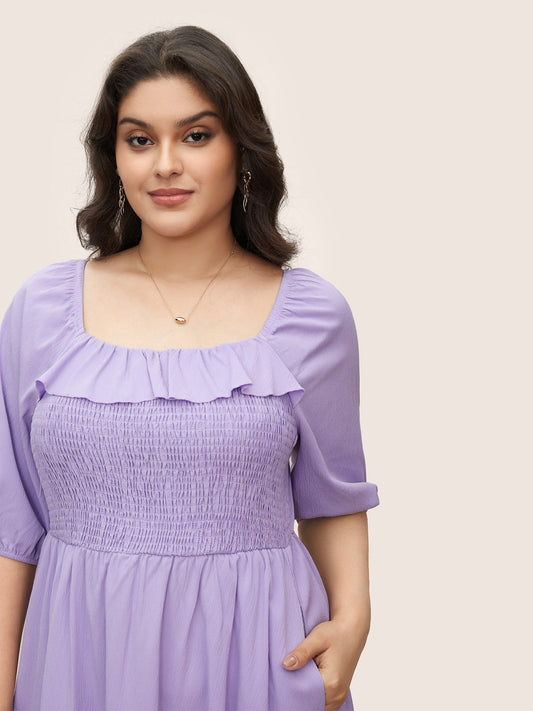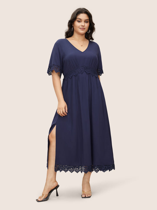 Solid Lace Panel Elastic Waist Split Hem Dress