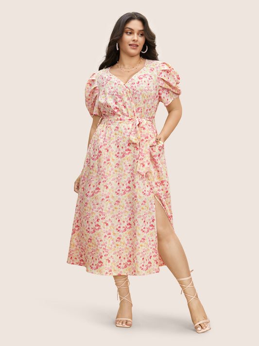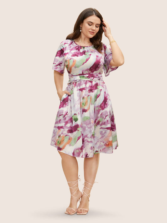 Watercolor Floral Print Ruched Ruffle Sleeve Dress