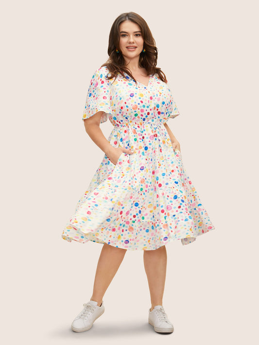 Colored Polka Dot Drawstring Ruffle Sleeve Dress