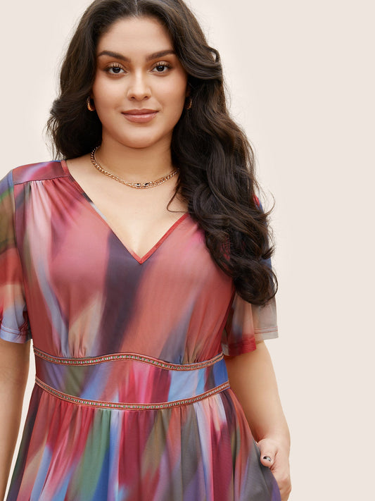 Geometric Button Detail Flutter Sleeve Midi Dress