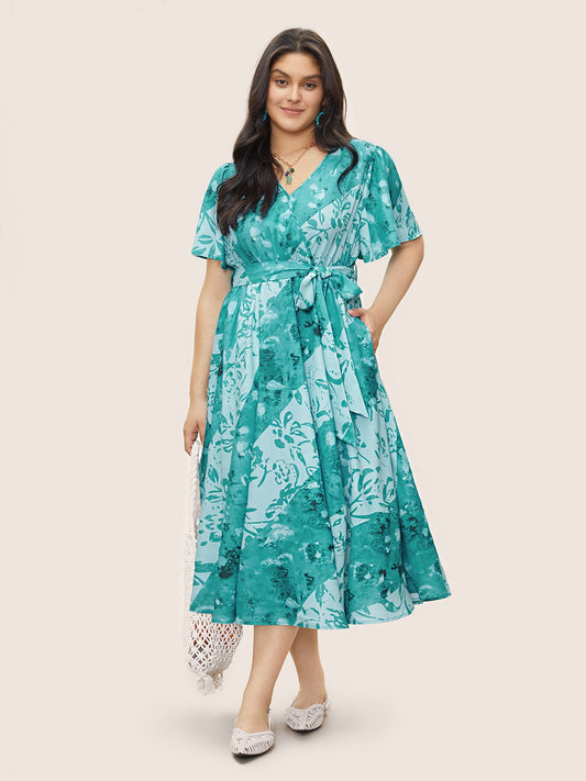 Graphic Elastic Waist Belted Wrap Dress